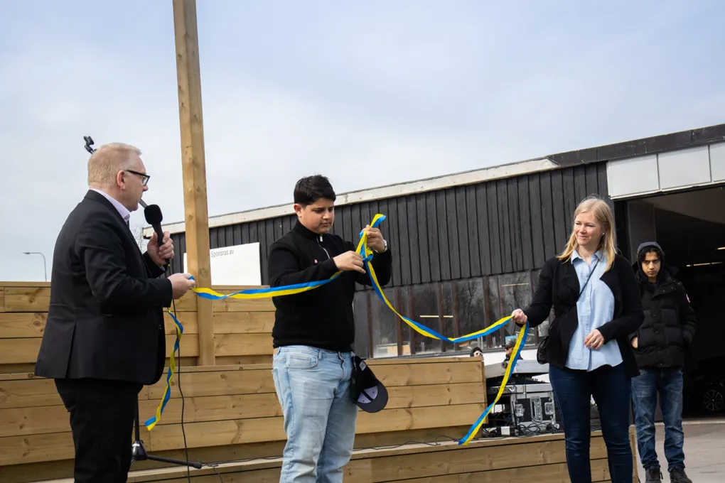 Sebastian Olsson (S) ordförande i samhällsbyggnadsnämnden, Dino Tanovic – representant från ungdomsrådet och Nina Rydström (C) ordförande i kultur- och fritidsnämnden invigde Alvesta Aktivitetspark genom att tillsammans knyta ihop bandet.
